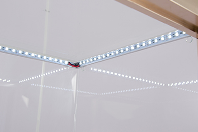 普通玻璃,超白玻璃 | 鋁制磨砂閃銀燈槽,超白玻璃無影膠無縫粘貼 | LED嵌入燈槽內(nèi),槽內(nèi)安全裝電線卡拉,電線不外露安全美觀 |